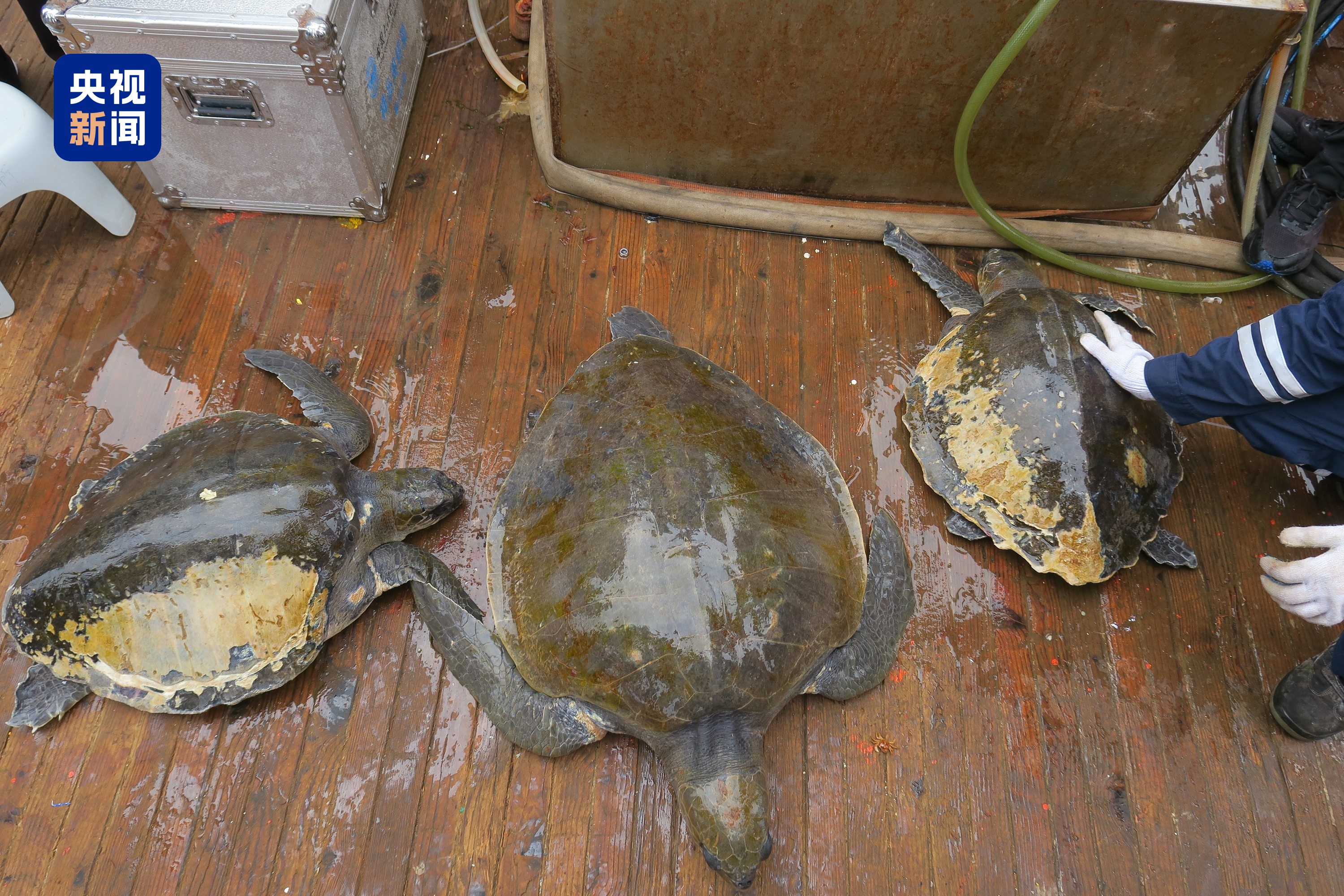 由于长期受渔网缠绕,海龟四肢和龟甲均有不同程度的勒痕和擦伤,伤势较重,好在没有明显骨折迹象,均能自由活动。科考队对海龟伤口进行消毒处理后,将它们放归大海。