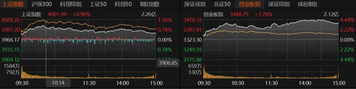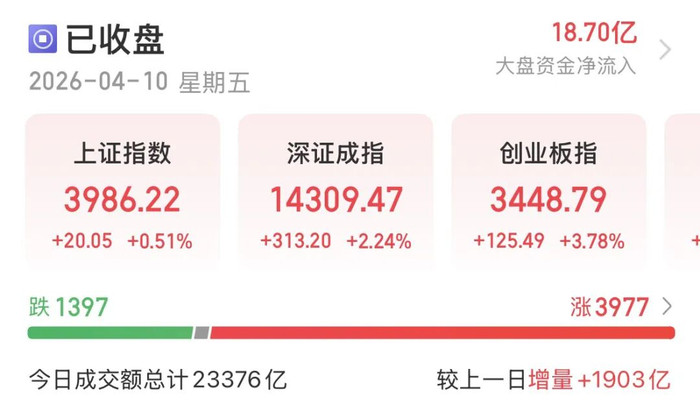 4月10日,A股赢利效应可以,沪指盘中重返4000点上方,创业板指涨近4%,3977只个股收红,量能放大至2.34万亿元,电力开发、电子、通讯板块领涨,非银金融板块走强。