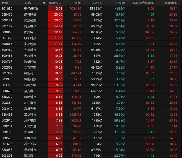 电子板块9只个股涨停,其中,晶升股份、英唐智控“20cm”涨停,奥尼电子、杰好意思特、联动科技、安克翻新等涨幅逾越10%,彩虹股份、无方光电、德明利、睿能科技、沃格光电等个股涨停。