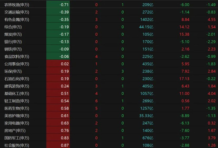 农林牧渔、交通运输、有色金属、煤炭、银行、钢铁、食物饮料板块收跌。