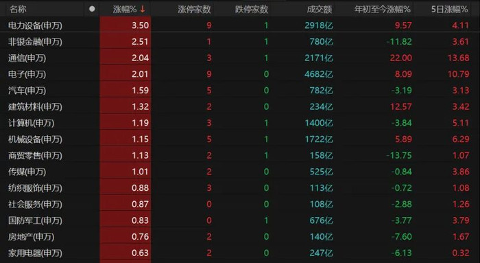 电源开发、非银金融、通讯、电子、汽车、盘算机、机械开发等板块走强。