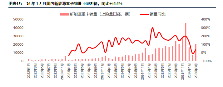 国内新能源重卡26年督察高增。2025年全年国内新能源重卡销量23.3万辆(上险数据,不含军车、出口),同比增长181.9%。2026年3月,国内新能源重卡销量20637辆,同比+37%,环比+170%;1-3月累计销量4.47万辆,同比+47%。