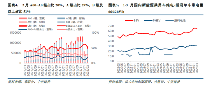 车型高端化带来的直不雅变化在于带电量擢升。26年1-3月纯电/插混平均单车带电量66/32kWh,而25年同期仅53/26kWh,单车带电量擢升27%,单车带电量擢升有用对冲面前内销同比下滑影响。