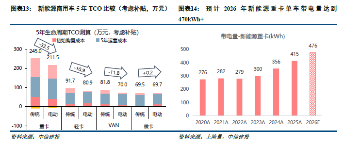 1)纯电商用车经济性已泄露。26年纯电重卡/轻卡/厢体车在补贴下5年TCO比拟燃油车量入为用33.5/10.9/11.8万元,对应本钱着落13.7%/11.8%/14.5%,具备彰着的经济性上风。