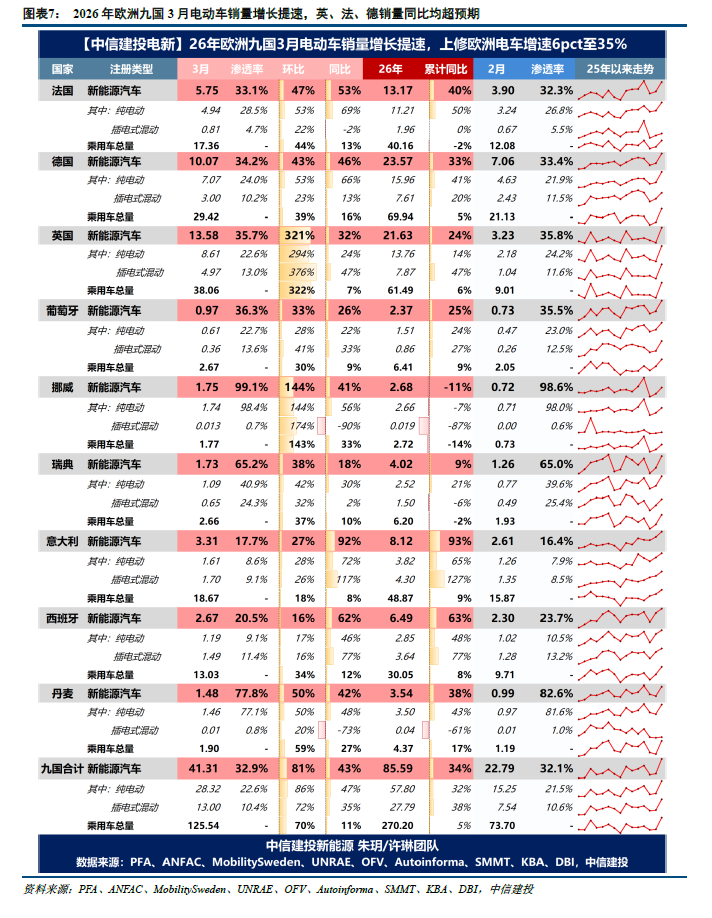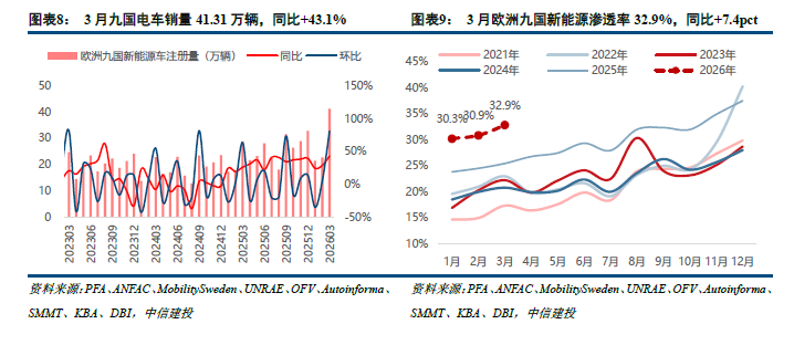 欧洲九国3月电车销量41.31万辆,同比+43%,环比+81%,浸透率32.9%,同比+7.4pct,环比+2.0pct。2026年1-3月欧洲九国累计销量85.59万辆,累计同比+34%,浸透率31.7%,同比+6.2pct。其中,英、法、德三国在战略握续刺激下销量初始增长提速,3月销量同比永别为+32%、+53%、+46%,增长均超预期;意大利、西班牙26年以来督察强势高增,主要系政府26年均出台新补贴决策,有用带动销量永别同比+92%、+62%。
