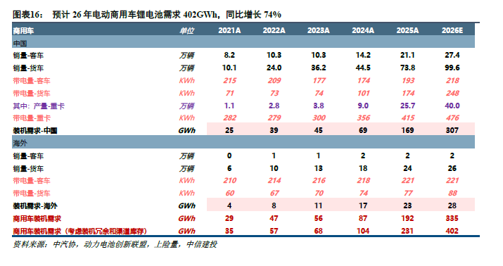 中国商用车需求超预期。超预期在于经济性泄露下电动重卡爆发,26年补贴督察下商量电动重卡基本督察高增速。26年中国电动重卡产量由32.5万辆上调至40.0万辆,同比由27%上调至+56%,单车高带电量将带动约35GWh需求增量,乐不雅预期下26年全球商用车锂电板需求402GWh,同比+74%。