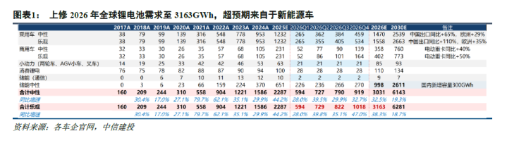 2025年全球锂电板需求2287GWh。原中性预期下2026年全球锂电需求3031GWh,同比+32.5%,现上调2026年全球锂电需求至3163GWh,同比+38.3%,该预测高于阛阓一致预期的2800-2900GWh(进步约13%)。上修全年需求主要系三大新能源车超预期照进履行:(1)中国新能源车出口超预期;(2)欧洲新能源车销量爆发超预期;(3)电动重卡经济性泄露超预期。