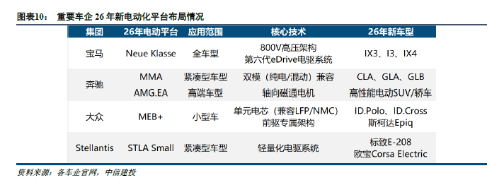 1)2026年泰西车企新平台发力,良马/疾驰/环球/Stellantis于26年推出的新平台均可用于照应中袖珍车型电动款短少,竞争力不足的问题,极大照应面前中小车型浸透率低的痛点;2026年商量将有至少20+款主力车型(全新车型+换代车型)上市,其中全新车型商量销量25+万辆,销量孝顺5.5%。