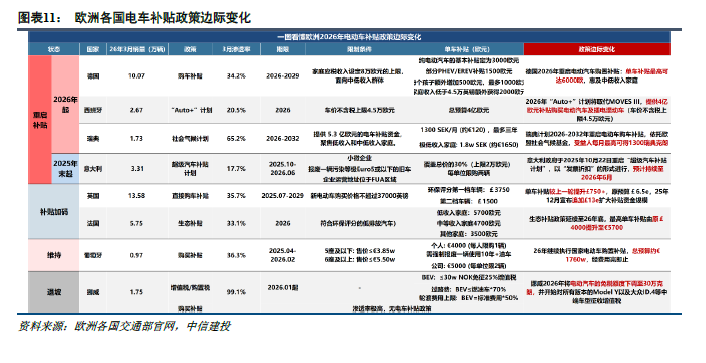 2)2026年,欧洲主要国度战略端握续加码为电车增长提供保险和托底。其中,英国、意大利的补贴撑握延续,德国、西班牙重启补贴,法国的单车补贴角落加强。