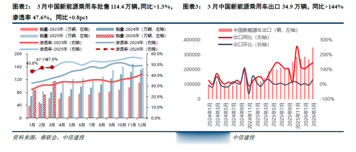 26年以来中国新能源车出口保握高增。凭据乘联会数据,中国新能源乘用车1/2/3月出口销量永别为28.6/26.9/34.9万辆,永别同比+106%/+127%/+144%,增速逐月擢升;1-3月累计出口90.4万辆,同比+126%。在出口带动+内销徐徐树立下,3月新能源乘用车批售同比转正,同比+1.3%,商量后续国内乘用车批售将进一步树立。