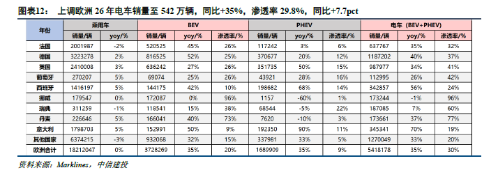 商量2026年法/德/英/葡/西/意/挪威/瑞典/丹麦电车销量永别为64/118/99/11/34/35/17/19/17万辆,永别同比+35%/+40%/+34%/+26%/+56%/+70%/-1%/+7%/37%。全体来看,上调欧洲26年电车销量至542万辆,同比+35%(原预期515万辆,同比+29%),浸透率29.8%,同比+7.7pct。剔除中国出口后,欧洲销量爆发可带动约15-20GWh的锂电板需求增量。
