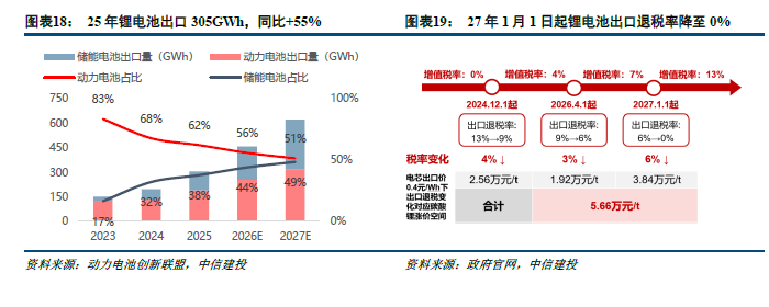 升值税出口退税退坡可能带来超预期的出口抢装。24年12月1日起锂电板出口退税率由13%降至9%,26年1月财政部、国度税务总局发布公告,于26年4月1日起将出口退税率从9%降至6%,27年1月1日起将出口退税率从6%降至0%。抢装一个月就有望带来40GWh+的增长。