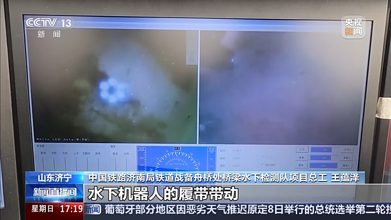 中国铁路济南局铁道战备舟桥处桥梁水下检测队项目总工 王蕴泽:附着在桥墩上的水草过去需要潜水员去清理,现在就可以用水下机器人的履带带动,用它的滚刷把水草清除掉。