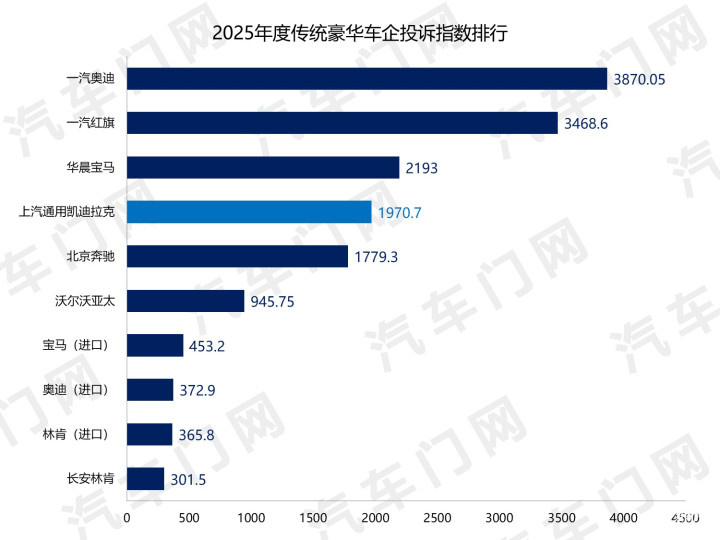先来看一组数据:2025年,上汽通用凯迪拉克排在了年度豪华车企投诉榜的第四位,逾越了北京飞驰,仅次于华晨良马。二线豪华车企中,上汽通用凯迪拉克的投诉指数高居第一,达到了沃尔沃亚太的两倍。推敲到远低于BBA的销量和保有量,上汽通用凯迪拉克的投诉率已冠绝豪华车企。