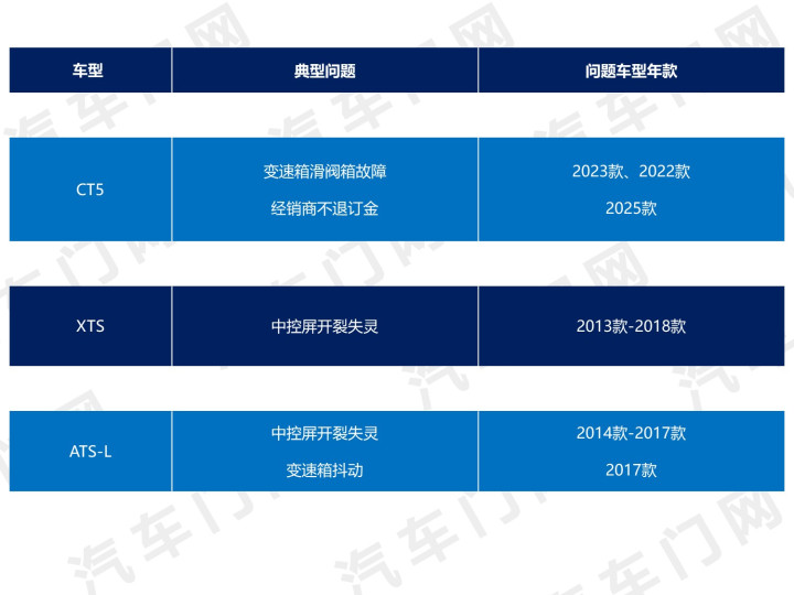 多位CT5车主响应,变速箱阀体损坏后,4S店齐示意厂家不发货。车主屡次致电厂家但永远不予处分。更多XTS和ATS-L车主响应称,中控屏失灵是通病,但厂家以过了质保为由不与质保维修。车主们简直不谋而合地条件厂家调回。