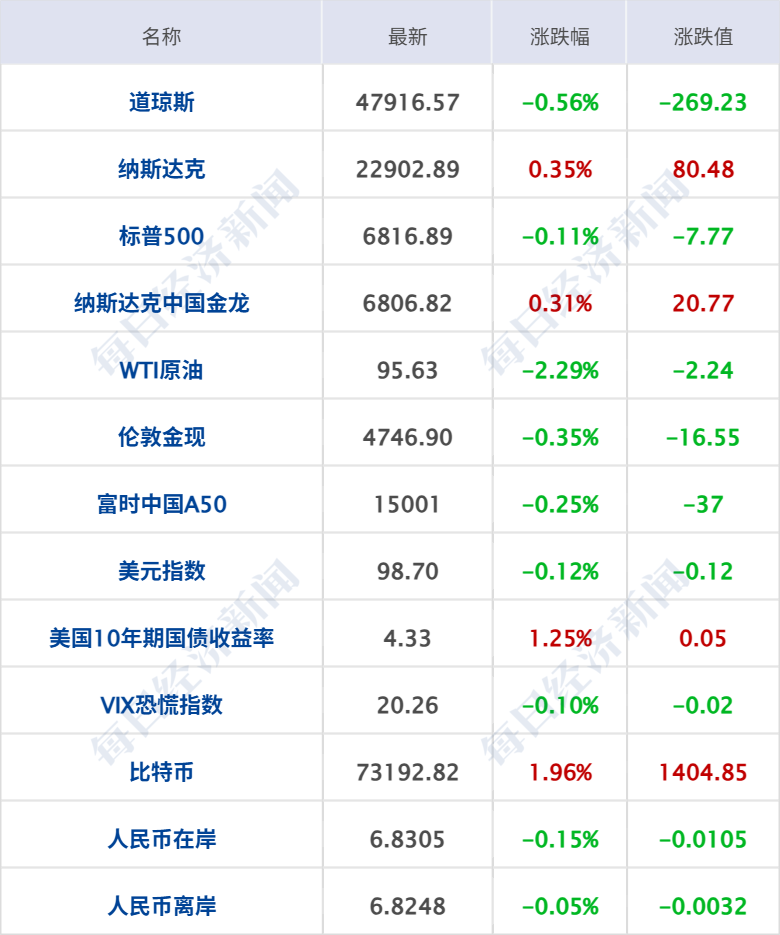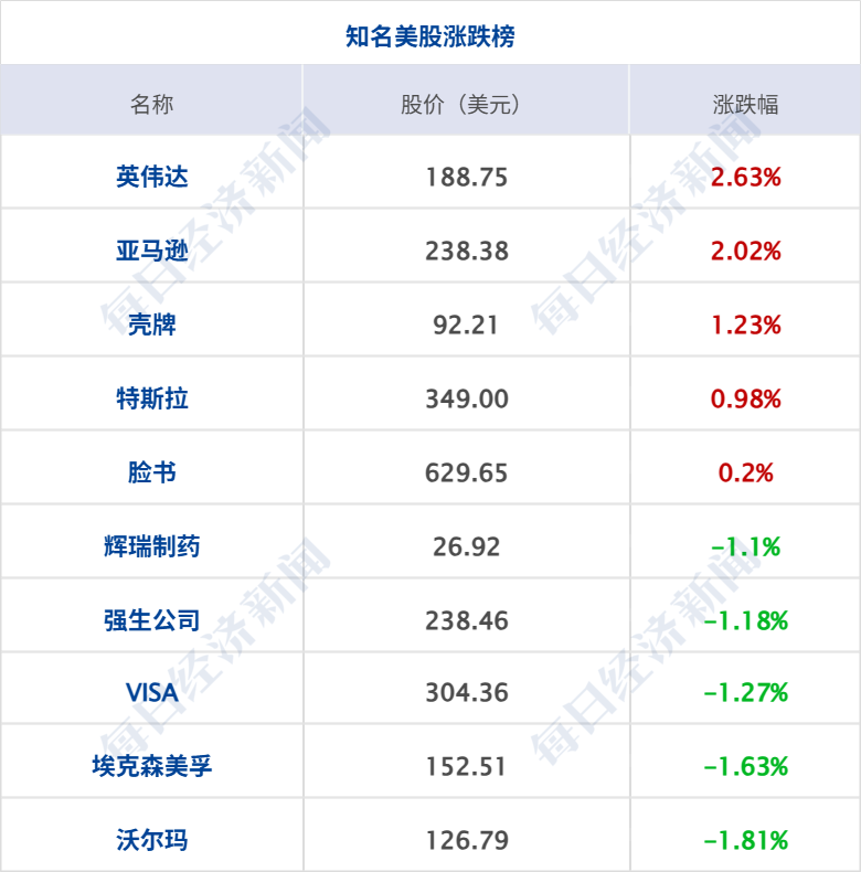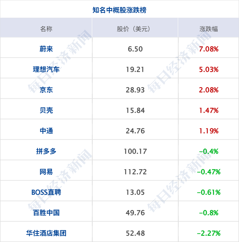 好意思股三大指数收盘涨跌不一,纳指涨0.35%并录得八连涨,标普500指数跌0.11%,说念指跌0.56%;周线方面,纳指本周累涨4.68%,标普500指数累涨3.56%并创客岁11月份以来最大单周涨幅,说念指累涨3.14%;科技股广泛走高,博通涨超4%,AMD涨超3%,英伟达、亚马逊涨超2%,英特尔涨1.07%。中概股涨跌不一,纳斯达克中国金龙指数涨0.31%,蔚来涨超7%,理思汽车涨逾5%,禾赛科技涨超4%,京东集团涨逾2%,爱奇艺、华住集团跌逾2%。